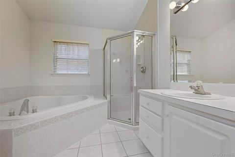 Don’t miss this spacious ranch, end unit home in the sought-after Willow Wood Community in Hauppauge. Designed for effortless single-level living, this home offers comfort and convenience throughout. The oversized living room boasts cathedral ceilings, a skylight, and cozy fireplace with sliding doors that open to a private outdoor patio. A bright, roomy eat-in kitchen provides the perfect space for casual dining. The expansive primary ensuite features a vaulted ceiling, a walk-in closet, complete with a luxurious soaking tub with a separate shower. A large second bedroom has a double closet which is ideally located near the hall bath. Enjoy the added convenience of an interior entrance to your private garage. This home combines style, functionality, and comfort—all in one appealing location.