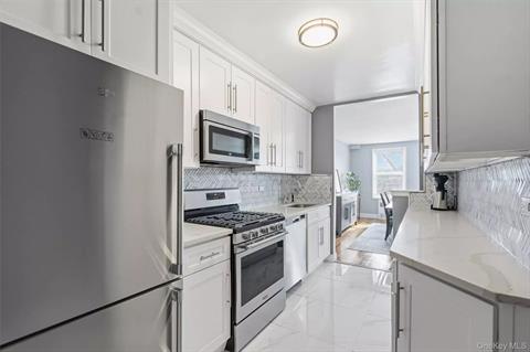 Welcome to this Luxury Turn-Key Large Junior 4 Co-op end unit with Balcony and Stunning Views.Experience elevated living in this beautifully renovated and completely turn-key Junior 4 unit. This stunning south facing end corner unit features an open-concept layout perfect for entertaining, with a seamless flow between the living and dining areas leading to a private balcony—ideal for unwinding and taking in breathtaking daytime & sunset views. No detail has been overlooked in this full renovation, showcasing modern finishes, a sleek kitchen with exquisite countertops & tiled backsplash, ultra convenient dishwasher, stainless steel appliances, and a spa-inspired bathroom with window. The large king sized corner bedroom with 2 windows offers an abundance of closet space, combining luxury with everyday functionality. Additional features include much sought after indoor garage parking, laundry in building and much more.Move right in to this true designer showcase unit—there’s nothing left to do but enjoy. Conveniently located near the LIRR, transportation and shops, this home provides easy and quick access to Manhattan while being surrounded by the charm and convenience of Douglaston living.