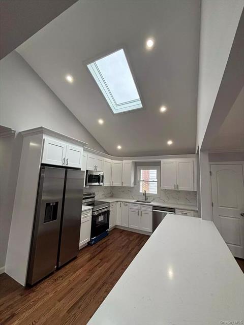totally renovated hi ranch like brand new house everything is done, features white shake kitchen cabinets, all new stainless steel appliances, quartz countertops, quartz breakfast bar, vaulted ceiling in kitchen with skylight an recessed lighting throughout, 4 spacious bedrooms, 2 new designer baths, large family room, with first floor bedroom an aux room an lovely new bath, new roof, all new siding, new windows, new heating system, so many extras must see