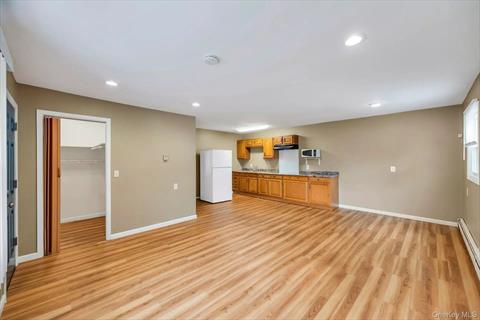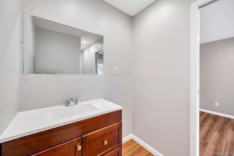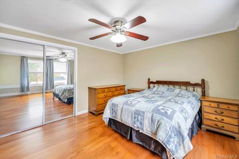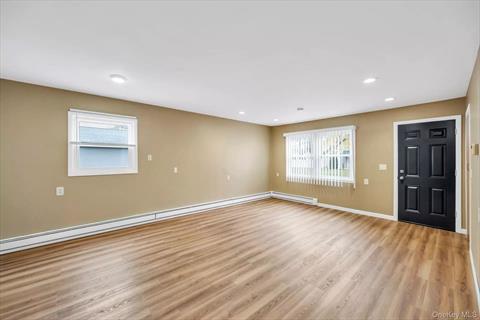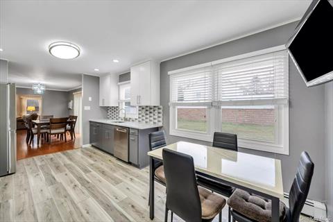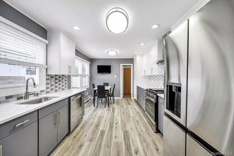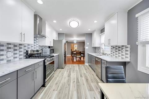 Incredible opportunity in the highly desirable Lake Grove Village, perfectly positioned in the sought-after T-section, offering sewer and sidewalks on an oversized corner lot. This expanded colonial immediately impresses with beautiful vinyl siding, a brick front facade, and a garage conversion with its own separate entrance, full bathroom, and certificate of occupancy—ideal for extended living or flexible use. The gorgeous home features real owned outright solar panels, practically off the grid. The property features an expanded blacktop driveway with Belgium block border and cement skirt, providing exceptional off-street parking. The private backyard is fully enclosed with beautiful vinyl fencing and enhanced by mature landscaping, a large stamped concrete patio perfect for entertaining, a stone retaining wall, and two oversized storage sheds. Inside, the open floor plan showcases beautiful hardwood floors throughout, a formal living room, custom molding and recessed lighting throughout, a spacious dining room, and an updated chef’s kitchen with grey bottom and white top cabinets, subway tile backsplash, quartz countertops, stainless steel appliances, an LG refrigerator, and a propane 5-burner stove. The first floor also offers a dedicated mudroom with washer and dryer and a separate entrance, plus an additional half bath off the kitchen. Upstairs, the enormous primary suite features hardwood floors, double closets and an updated primary bath with a glass stand-up shower, while the additional bedrooms are generously sized with hardwood floors and the hallway bath includes a tub and glass shower. Additional home features include professionally updated windows in select areas including the bathrooms and front of the house, one electric meter, three heating zones, pull-down attic stairs, a four-zone sprinkler system, 150-amp electrical service, a full unfinished basement with high ceilings and updated windows, a Weil-McLain boiler with Riello head and water storage tank only two years old, white PVC fencing, LED lighting, crown molding, cameras and alarms, and excellent closet space within the garage conversion. This rare offering delivers space, flexibility, and tremendous value in one of the most desirable pockets of Lake Grove.