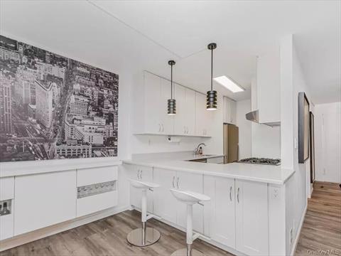 Welcome to this lovely one bedroom apartment in one of the sought after buildings in Riverdale, MANOR TOWERS.A beautiful open concept kitchen/living& dining space. The apartment boasts an Expansive view with all windows looking out towards Queens and parts of NYC. Tons of light pour in every morning . Beautiful shades adorn all of the windows with a remote control which can open, raise and also lower them when needed. There are 2 walk in closets(one currently is an office that you can hide when the doors are closed) plus 3 other large ones. The renovated open kitchen has a counter at one end with stools and cabinets. Stainless steel appliances and white tiled walls. The bathroom has a new pedestal sink and mirrored cabinet above.The large bedroom also has a double closet . Manor Towers has a 24 hour doorman , circular driveway, storage room, live-in super and assistant, indoor parking available, pets allowed (certain breed restrictions) and more than 1 dog is possible.In the summer there is a heated salt water pool with cabanas and a snack bar. A large deck with benches , tables and planters just prior to the pool can be used even if the pool is closed. The friendly staff is always ready to help.