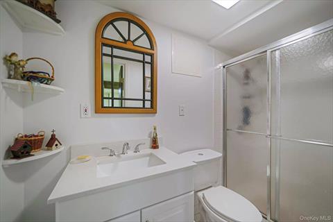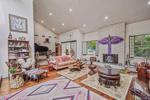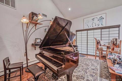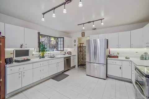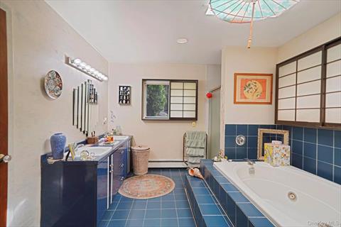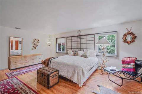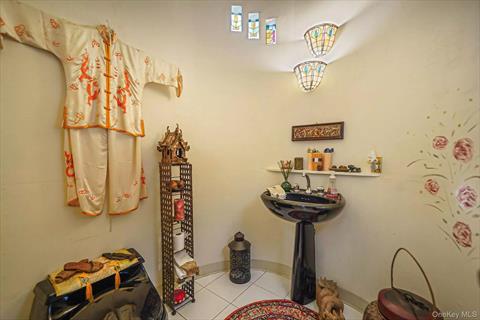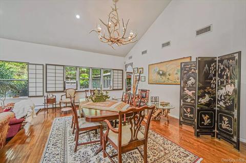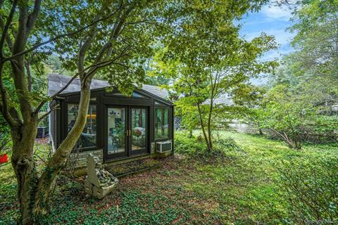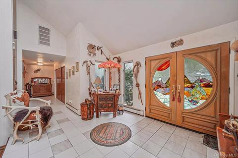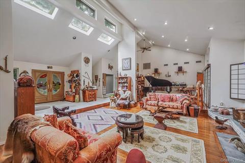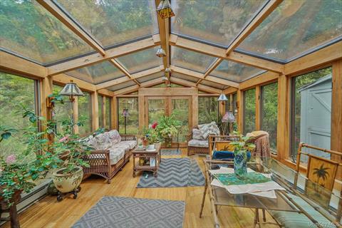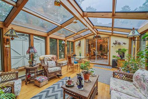 Welcome to this exceptional Fort Salonga residence offering over 4, 000 sq ft of living space on a private, wooded acre. This 4-bedroom (with option for a 5th) home showcases an open-concept dining room, living room, and elegant sitting room accented by a piano, all enhanced by soaring ceilings, skylights, and walls of windows that fill the home with natural light. The primary suite boasts a walk-in closet, jacuzzi tub, and glass shower. Enjoy year-round relaxation in the heated conservatory and unwind in the unique two-level sauna. Additional highlights include hardwood and tile floors, stainless steel appliances, custom stained-glass entry doors, a 2-car garage with heated storage, stone terraces, and a basement. Modern comforts include 3 heating zones, dimmable lighting, whole house alarm system, and a whole-house Kohler generator. With over an acre of privacy, handmade stone walls, a dog run with barn, and ample parking, this property is a rare North Shore retreat.