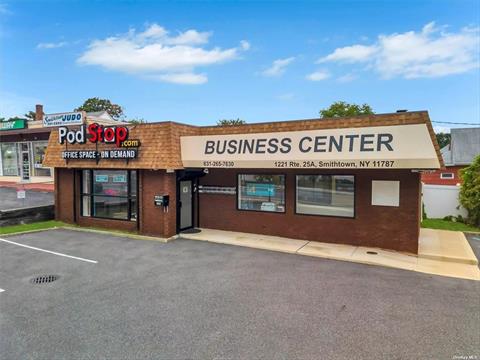 Incredible opportunity! Completely renovated three years ago from the ground up. Freestanding corner building in Smithtown. Offers 1, 750 sq ft of usable space! Properties located on incredibly highly trafficked 25A. 8 parking spots. Building is completely handicap accessible, currently zoned for 50 people. Renovations include but not limited to roof, facade, windows, HVAC, electrical, plumbing, parking lot, surveillance, sprinkler system. Building is completely smart powered and can be operated remotely, thermostats and lights. Doors have smart technology - one push of a button and window can go from completely clear to frosted. Front of building has tremendous glass windows, great visibility from road. Has tremendous area for signage and branding. First floor includes high ceilings, open floor plan, hardwood floors, custom raised paneling, box molding. Spa like first floor handicap accessible bathroom. Mahogany wood stairs leading to finished basement with CO. Three egress windows, high ceilings. Enclosed conference room, 200 amp electrical service, gas heat. Two zone central AC. Douglas mini split for the basement. Low taxes. Previous property uses for building were bagel Store, grease traps existing, liquor store, dry cleaner. Currently being operated as business center and on the go office space. All furniture and pods being sold with building. Across the street CVS first row is public parking if owner user needs more parking. Owner is retiring let’s make a deal!, Additional information: Building Size:1000