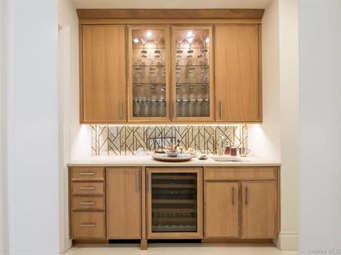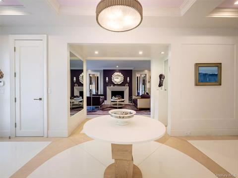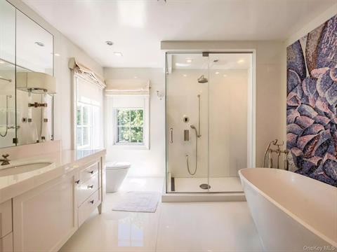 French Modern residence, built in 2018, seamlessly blends contemporary luxury with timeless design. Perched on a prime setting and offering over 7, 000 square feet of refined living, the home presents a stately facade with a columned portico, dramatic windows, and iron-framed glass doors that open to a museum-inspired foyer with marble floors and art niches. The main level is designed with comfort, elegance, and entertaining, featuring spacious living and dining rooms, a bright private study, powder room, library with custom built-ins, and a guest suite with en-suite bath. The inviting family room extends through French doors to the terrace and heated pool, creating seamless indoor-outdoor living. Additional highlights include an extra half bath, back staircases, and an attached garage. High, uniquely styled tray ceilings, intricate moldings, and pocket doors enhance the home’s flow and architectural character.The chef’s kitchen is a true centerpiece, boasting marble counters, three Sub-Zeros, five ovens, an eight-burner stove, three Miele dishwashers, and a sunlit breakfast room overlooking the lush yard.A striking custom staircase with bold geometric iron balustrades leads to the second level, which offers five bright ensuite bedrooms, each with distinctive tray ceiling designs. The luxurious primary suite features a spa-like bath with artistic mosaic tilework, a magical balcony with seasonal water views, generous custom closets, and the convenience of an upstairs laundry room.The full lower level expands the living space with three additional bedrooms, four full baths, a second kitchen, a den, a playroom, a glass-walled gym, a wine cove, a recreation area, and a secondary laundry with two washers and two dryers. High ceilings and a walk-out design enhance the sense of light and space.Additional features include radiant heat warming all stone floors throughout, a full-house generator, and an elevator shaft already in place for future installation. Outdoors, manicured landscaping and mature hedgerows provide privacy around the expansive bluestone terrace, lush lawn, and heated pool.Located in the prestigious Village of Great Neck Estates MUST SEE! A true standout residence!