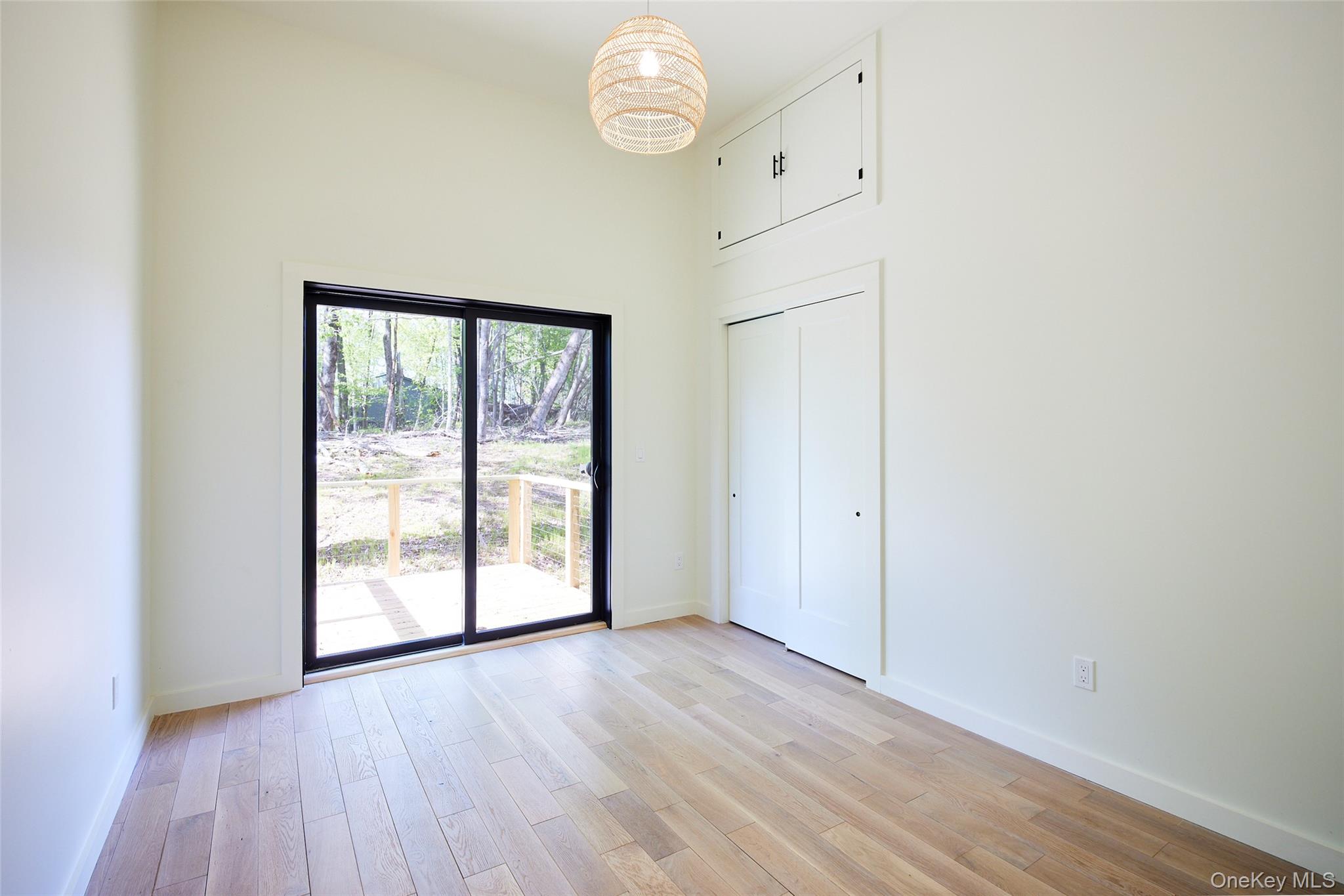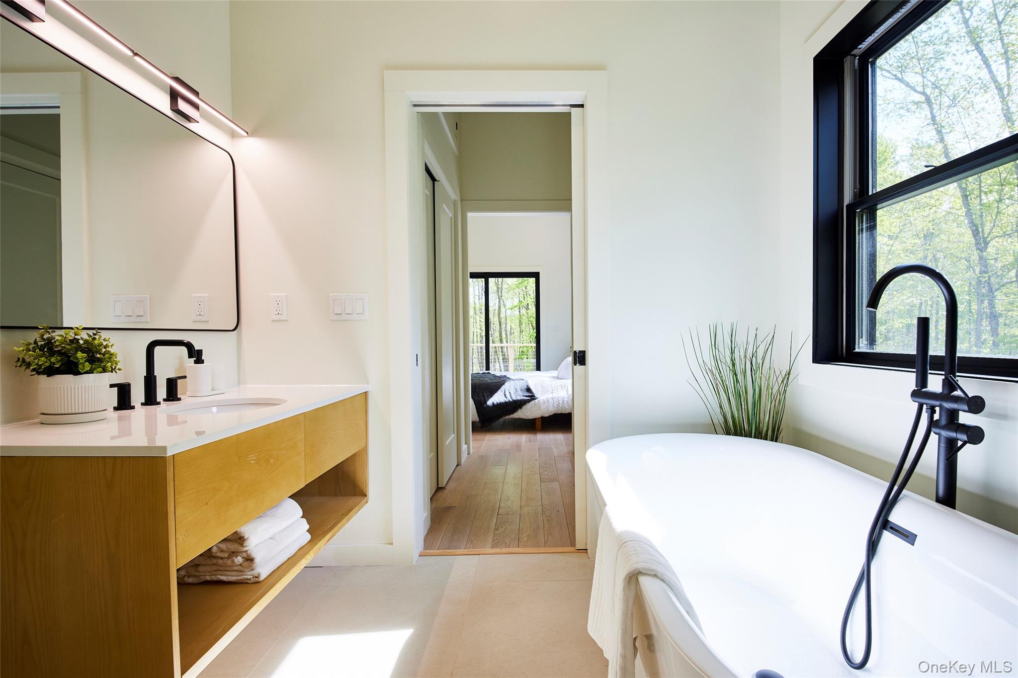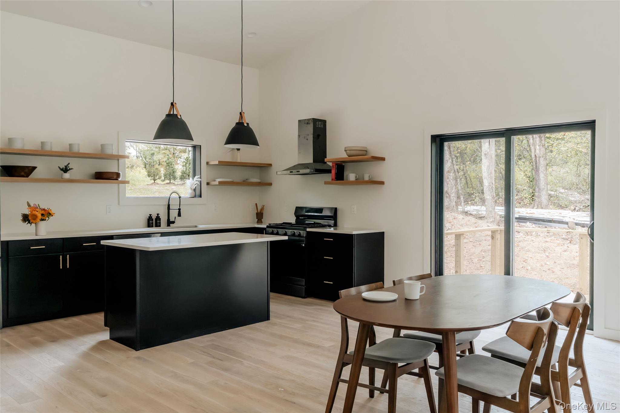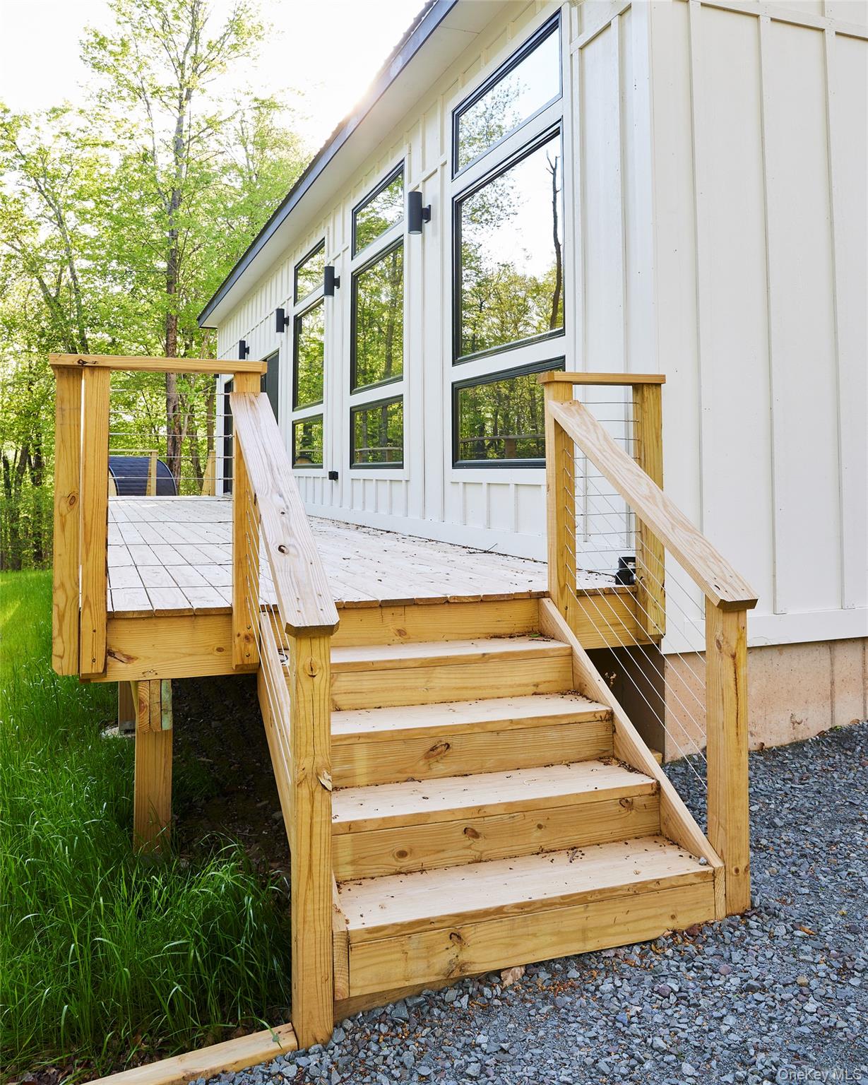 In a quiet corner of the Western Catskills, sits Woodsview Hideaway, a stylish modern retreat. Designed with an eye towards maximizing the enjoyment of the surrounding landscape, this beautiful home in Jeffersonville, NY is brand new and move-in ready for its first owners. The entranceway offers a convenient coat closet and guides you into the sleek and spacious kitchen. Modern flat front black cabinetry is complemented by open shelving, white granite counters, and black stainless appliances. The island provides a nice visual break from the main living space as well as convenient additional storage and counter space. The dining space and main living area take full advantage of the light and views from glass sliding doors and walls of oversized windows, highlighting the surrounding landscape and offering plenty of room for gathering with friends and family. The high ceilings maximize the natural light and keep the space feeling like an expansive extension of the outdoors. All three bedrooms at the Hideaway feature sliding glass doors out onto a deck and plenty of storage space. The primary suite adds a show-stopping picture window and double closets leading to a beautifully tiled en suite bath with walk-in shower, large soaking tub and double vanity. An additional tiled bath with walk-in shower and a convenient laundry room finish off the indoor spaces. White oak floors and high ceilings feature throughout. Central heating and a/c will keep you comfortable year-round, and spray foam insulation throughout keeps everything energy efficient. Hardiplank siding and a metal roof offer easy maintenance in the future. Outdoors, the large deck provides plenty of space for outdoor hangs. Follow it out to a lower platform with a two person sauna - a luxurious escape during chilly winters, or just a cool Catskills evening. A spacious flat lawn wraps around the house, with a large firepit area on the rise just behind the house. Located conveniently to several of our favorite Upstate Main Streets, Woodsview is just five minutes from the town of Jeffersonville, and fifteen minutes from both Livingston Manor and Callicoon.