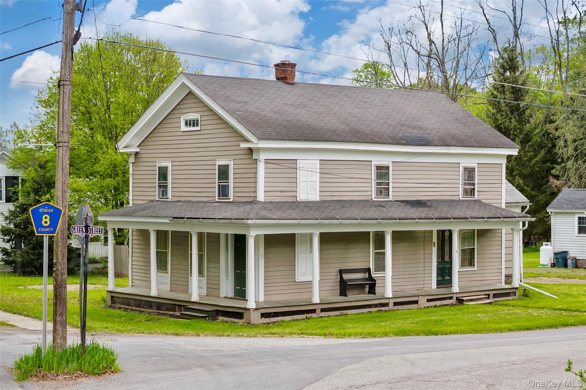 Consider your options! Your new home. A terrific investment. Even a 2-family option. Central to the wonderful village of Gilbertsville, NY, with its unique blend of tranquility, natural beauty, and community spirit, this classic period piece offers options. Beginning its life in the 1850s as a single family residence styled simpler than, yet in keeping with, many of its elegant neighbors, this building has a stately half-wrap covered porch with hexagonal columns, two sturdy arched glass entrance doors, and period-true cornice returns. Inside the home the first floor presents with freshly painted walls, hardwood floors, some original painted wide-plank, 2 light-filled bedrooms, a spacious newer kitchen and a convenient full bath with standing shower. The second floor has 2 additional bedrooms and another full bath. There is the beginnings of a second kitchen with cabinets, counters and sink all installed. A supplemental propane-fired air handler in the kitchen (condition unknown). With separate electrical meters and isolated circuit panels, lockable doors and separate entrances, this is ready for 2-family living. The dry basement houses a forced hot air furnace from 2025, up-to-date electrical systems, and electric hot water heater. The corner lot offers over a quarter acre of space to play, garden or just relax. A gravel driveway keeps 3 or 4 cars comfortably off the street. Surrounded by picturesque landscapes, rolling hills, forests, and framed by Butternut Creek, the home is just a short drive from Oneonta, Norwich and Cooperstown. Ideal for those who appreciate a rich historical background, classic architecture and local culture, Gilbertsville hosts various local events throughout the year, which encourage community participation and bring residents together for fun and socializing.