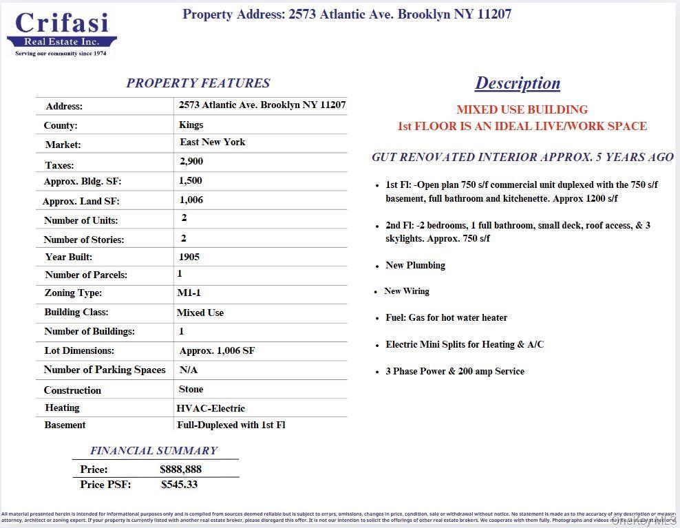 This mixed-use property offers an ideal live/work space. It has been Fully gut renovated in 2020 with all systems updated. The spacious duplexed studio, spanning approximately 1, 400 sq. ft., includes a kitchenette, bathroom, and access to a full basement which is included with the unit. This unit is currently rented for $2, 500 per month with a short term 6-month lease and then month to month afterwards. The second-floor unit, approximately 750 sq. ft., features a well-appointed kitchen, a bright living room, two bedrooms, and a full bathroom. The apartment boasts gorgeous wood floors, three skylights that flood the space with natural light, and access to a private deck and rooftop space. The Current tenants pay $2, 500 per month and have a month-to-month lease. The storefront, basement, and back patio offer dual income. This property incurs low expenses with tenants paying all utilities and heat. The owner pays minimal gas, water, real estate taxes and insurance. With an approx. NOI of $50, 600, based on CAP rates in the area this property offers a higher return compared to similar properties. Both units are equipped with mini-split systems for efficient heating and cooling, ensuring year-round comfort. This property has been thoughtfully renovated with all-new wiring, plumbing, and mini-split systems. Additionally, it is upgraded with 3-phase power and 200A service, offering optimal electrical capacity for modern needs.Please note, in order to view the 2nd floor on the video walk through: When the video starts, it shows the studio facing the kitchen and bathroom area. To access the second floor, you’ll need to turn the view around to face the opposite door. There, you’ll see a circle with an arrow. Hover over it, and an option to go upstairs will appear. Once you click this, it will take you to the second floor.